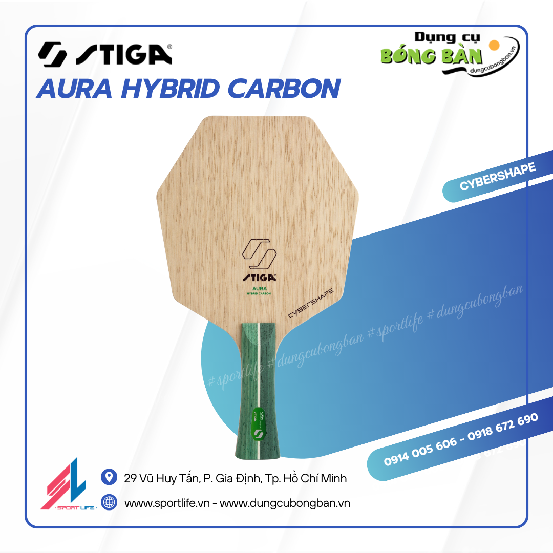 Điểm nổi bật của dòng vợt này nằm ở cấu trúc Hybrid Carbon độc đáo, kết hợp sợi carbon siêu nhẹ với lớp sợi giảm rung màu xanh. Nhờ công nghệ CCF (Close Core Fibre) – đặt lớp carbon ngay sát lõi gỗ – Aura Hybrid Carbon mang đến cảm giác bóng tuyệt hảo, vừa ổn định vừa mạnh mẽ, giúp người chơi làm chủ thế trận ngay ở tốc độ cao.