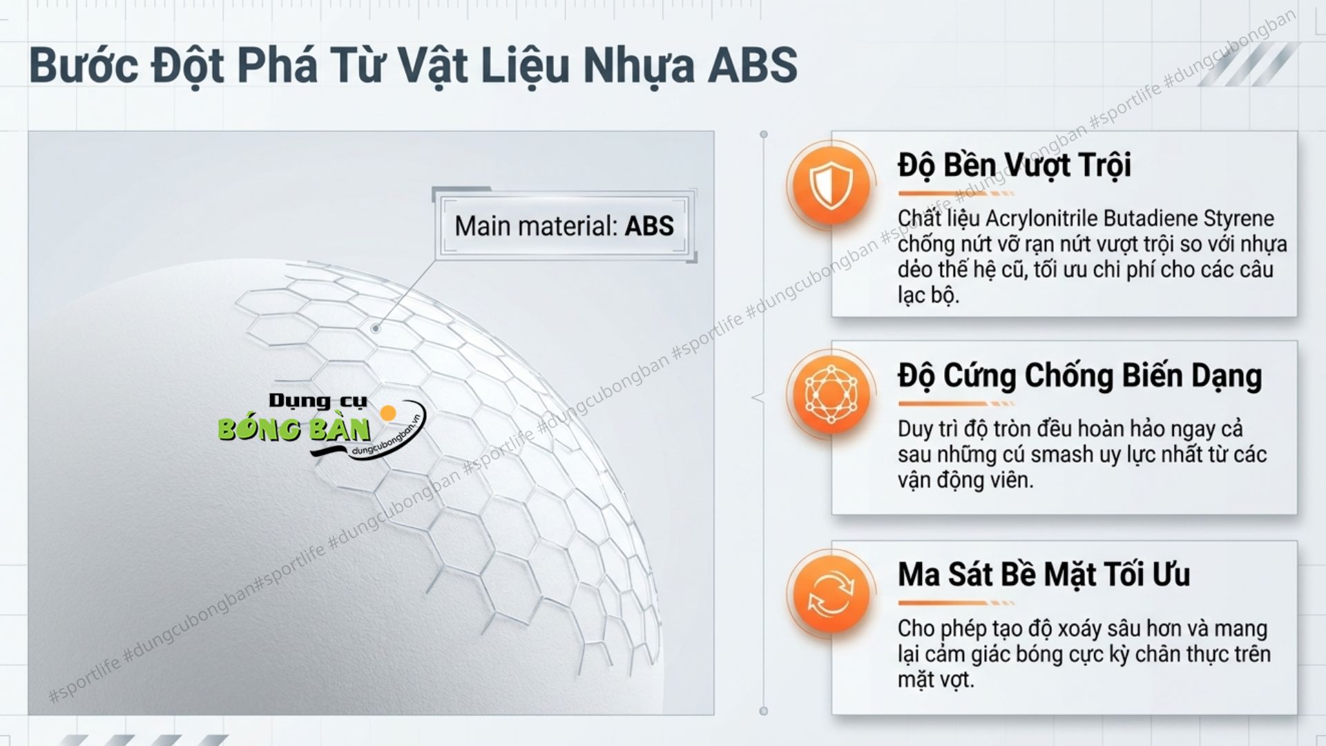 Chất liệu ABS độc đáo có tính năng 'hấp thụ nước' thấp," độ tròn "cao, và "biến dạng" thấp. Bất kể trong thời tiết nóng và ẩm từ phía nam hay thời tiết khô và lạnh từ phía bắc, các quả bóng vẫn không dễ bị biến dạng và vỡ, độ ổn định cao, độ bền và độ bền. độ nảy cao và tốc độ cao mang lại cho bạn trải nghiệm chơi tuyệt vời.