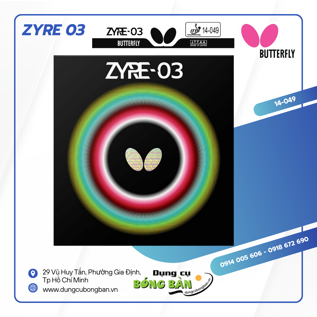 Butterfly đã phát triển dòng Zyre với định hướng tạo ra một loại mặt vợt không chỉ mạnh mẽ mà còn mang lại cảm giác giữ bóng tốt. Ở phiên bản Zyre 03, hãng đã đưa vào nhiều cải tiến đặc biệt như: